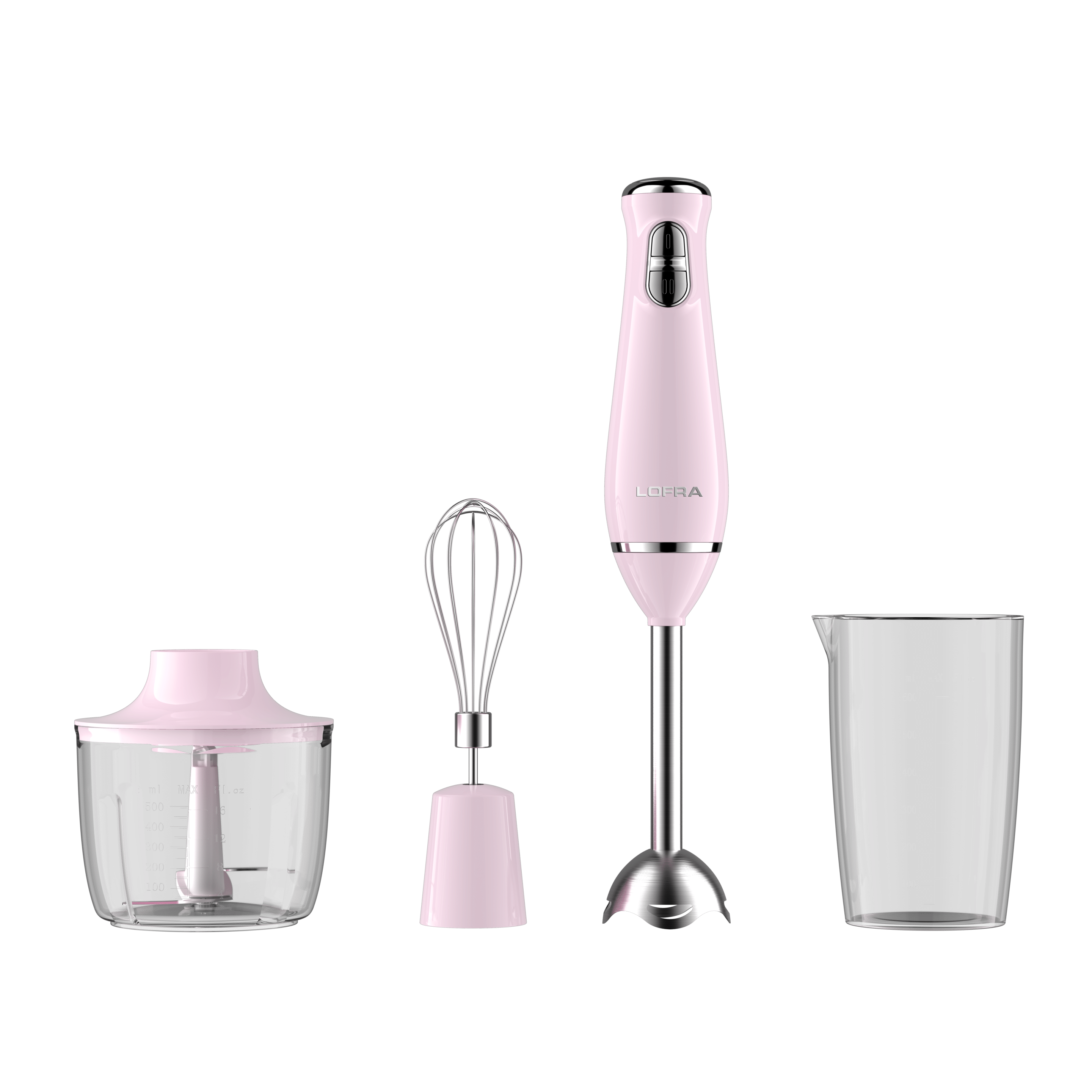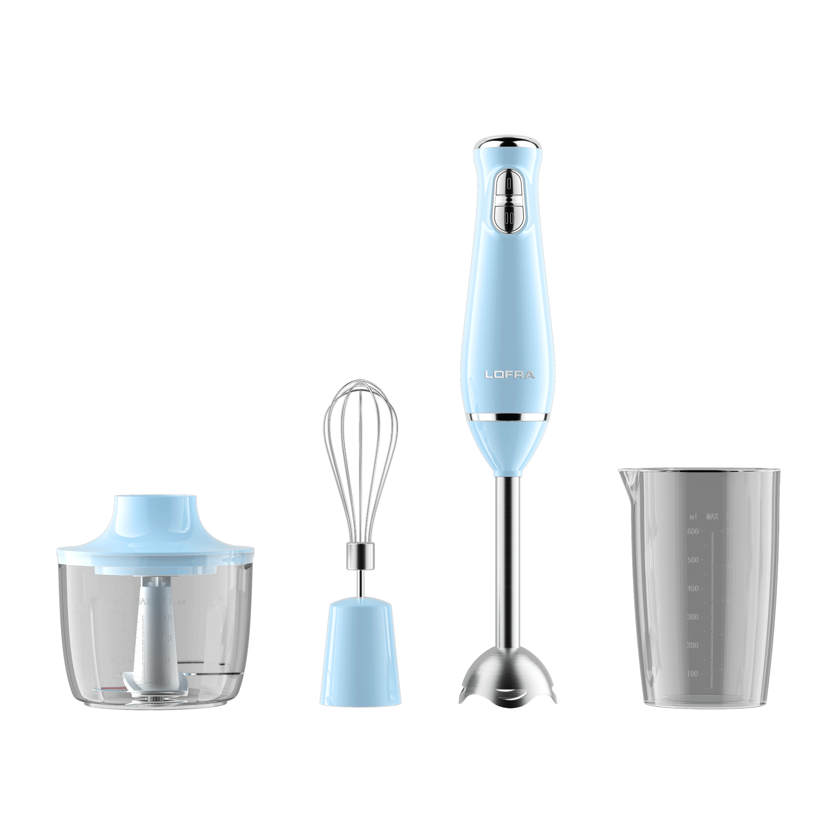 Les accessoires en acier inoxydable garantissent robustesse et durabilité. Le set comprend un blender à pétales, un fouet à œufs, un récipient hachoir de 0,5L et un gobelet de 0,6L, parfaits pour un usage polyvalent et créatif au quotidien.