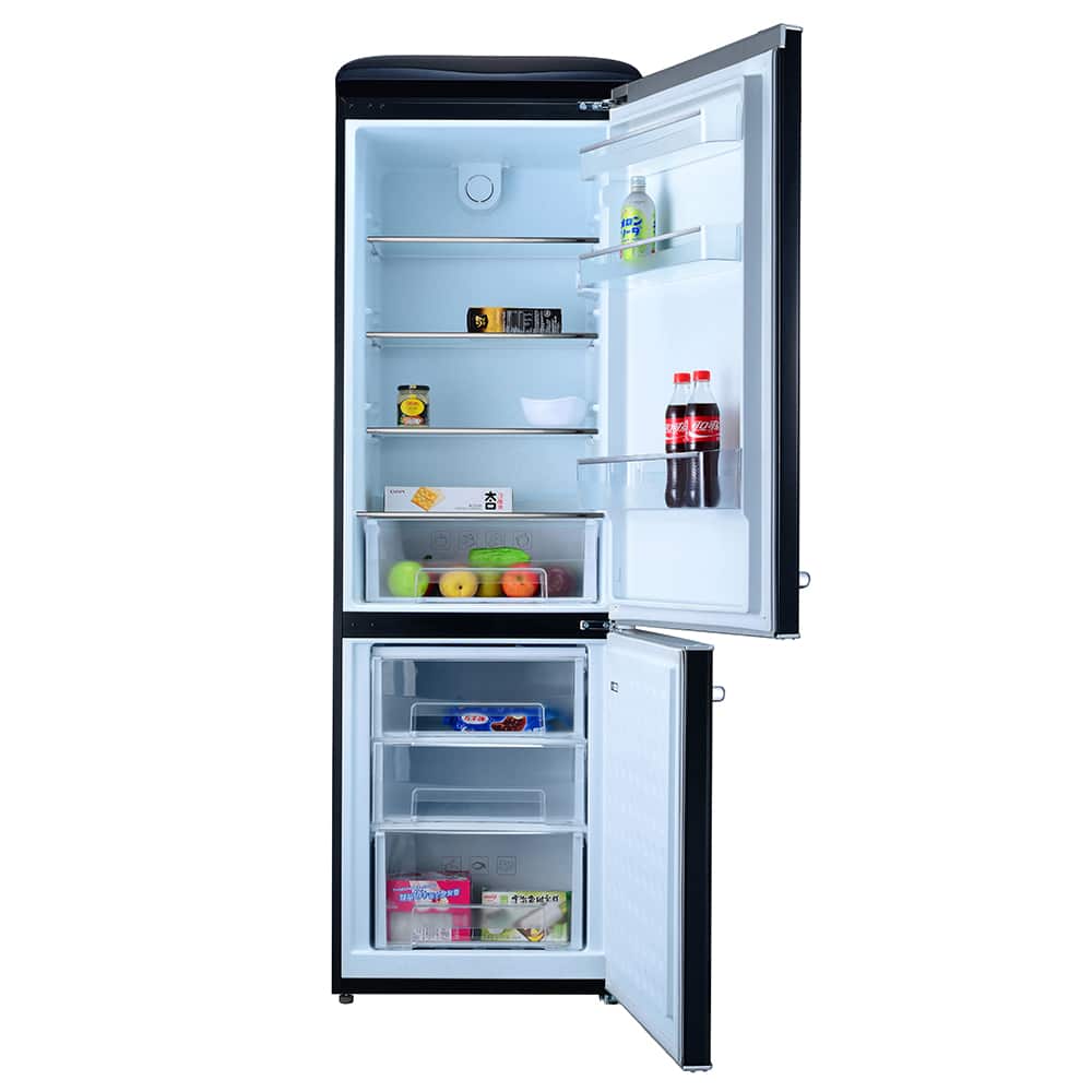 Spacieux, silencieux et au design raffiné, ce réfrigérateur style rétro est disponible en Noir mat, Ivoire, Bleu clair et Rouge.